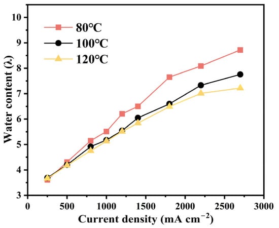 At 200 kPa and 43% RH, the water content in PEM with the increase in current density during operation at 80/100/120 °C.