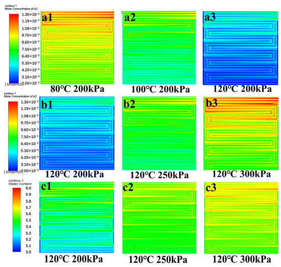 Moreover, the distribution of the molar concentration of oxygen in the cathode CL is depicted in Figure 8a1–a3. It can be seen that as the temperature rises to 100 °C, the oxygen distribution in the CL becomes more uniform, enhancing catalyst utilization. However, at 120 °C, the molar concentration of oxygen in the CL decreases significantly. Increasing back pressure raises the partial pressure of the reaction gases, thereby increasing the molar concentration of oxygen, as shown in Figure 8b1–b3. This enhancement accelerates the electrochemical reaction and further improves the back diffusion ability of water, which helps to humidify the membrane, as shown in Figure 8c1–c3.