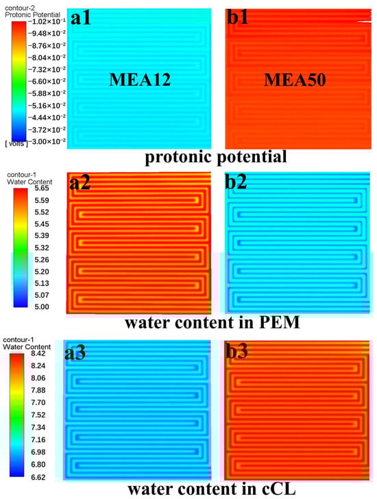 At 100 °C and 250 kPa, proton potential in membrane of (a1) MEA12 and (b1) MEA50, water content distribution in the PEM of (a2) MEA12 and (b2) MEA50, and water content distribution in cathode CL of (a3) MEA12 and (b3) MEA50.