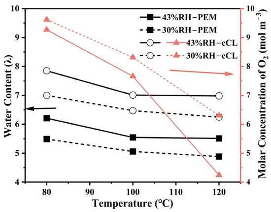 At 200 kPa, the water content and oxygen molar concentration of the MEA at 30%/43% RH and 80/100/120 °C.