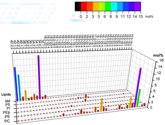 The molar composition of the main phospholipid species of the cytoplasmic plasma membrane leaflet (PM) is given in mol%, according to a previous report [11]. The axes indicate the lipid headgroup, number of carbons, level of unsaturation, and lipid molar fraction. A color code highlights the molar fraction for straightforward comparison, as described in Figure 1.
