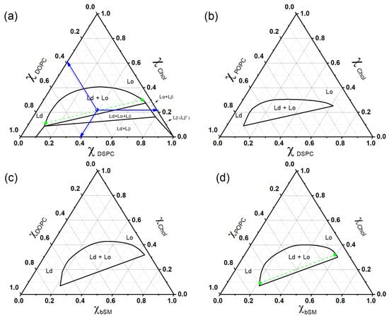 Ternary diagrams for (a) DSPC/DOPC/chol, (b) DSPC/POPC/chol, (c) bSM/DOPC/chol, and (d) bSM/POPC/chol, T = 23 °C. In diagram (a), the composition coordinates for a particular point P along the axes are indicated as DSPC/DOPC/chol = 0.39/0.39/0.22 (as highlighted by the blue arrows). The lipid mixtures (a,c) form domains on the scale of micrometers, whereas the lipid mixtures (b,d) form domains on the scale of nanometers [34,35,36]. The green dashed line indicates the tielines, which are discussed later in the text.