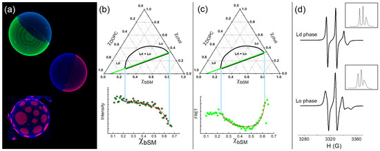 Other techniques are advantageous in investigating the coexistence of the Ld and the Lo phases. Electron spin resonance (ESR) can offer supplementary evidence regarding domains exhibiting distinct physical properties, such as the lipid packing/order. In ESR experiments, we employ a paramagnet probe with a spin quantum number of S = 1/2. In the presence of an external magnetic field, H(G, Gauss), the electron’s magnetic moment aligns itself either antiparallel or parallel to the field; this is known as the Zeeman effect. In addition, the hyperfine structure causes the splitting of the electronic energy levels. The radiation absorption in the microwave frequency range leads to the spectra shown in the insert of Figure 3d. Figure 3d shows the first derivative of the ESR absorption spectrum (ESR signals) obtained for the Ld (upper panel) and the Lo (lower panel) phases of DSPC/DOPC/chol, as previously reported [40]. The line width and the height of the peaks are related to the motion of the paramagnetic probe. The phenomenological parameters emanating from the ESR signal can also describe lipid packing/order. Alternatively, one can simulate the ESR signal following a defined methodology, which involves solving the spin Hamiltonian and finding parameters that adjust to the experimental data [56]. In this mini-review, we refrain from providing a formal definition of order, as we are not using any parameter to compare lipid packing. Therefore, we utilize the term “lipid packing/order” to convey our concepts effectively.