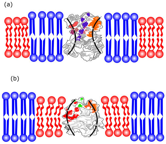 The images illustrate the phase preferences of protein localization in symmetric bilayers according to their shape. The cartoons were inspired by the model proposed by [76]. (a) A concave protein prefers ordered domains. (b) A protein with a convex shape favors disordered domains.
