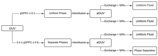 Microscopy fluorescence techniques can immediately identify the coexistence of phases when the sizes of the lipid domains are above approximately 200 nm. Utilizing this technique involves creating GUVs; the most predominant method, known as Electroformation, typically produces a compositional error of roughly 5 mol%. In addition, GUVs with a lipid mixture of three or four lipids are prepared at a temperature above the main transition of those lipids to ensure ideal mixing. The cooling rate of these GUVs to room temperature could also affect domain sizes, as reported [42,52]. Thus, this technique may not be the most accurate to map phase diagrams.