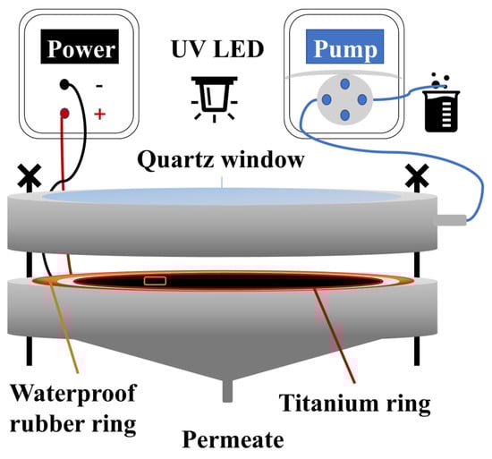 A UV LED light was selected as the experimental light source at a peak wavelength of 365 nm. The light transmission window of the membrane reactor was 1 mm thick quartz glass; the light transmittance was above 94%. The central part of the membrane reactor was designed and processed with polymethyl methacrylate. The membrane support layer was a high borosilicate glass filter plate with a thickness of 5 mm and a pore diameter of 16–30 µm. The reactor filtrate drive device was a peristaltic pump purchased from Kamoer Fluid Tech Co., Ltd. (Shanghai, China). The cathode of the photo-electrocatalysis filtration system was a stainless steel mesh placed on the supporting layer, and the anode was a PES/CNTs@TiO2 membrane. The cathode and anode were stacked and separated by a PES membrane. The schematic diagram of the photo-electrocatalytic filtration device is shown in Figure 1.