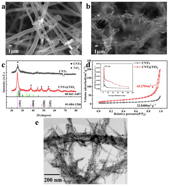 (a,b) SEM images of CNTs and CNTs@TiO2; (c) XRD patterns of CNTs and CNTs@TiO2; (d) N2 adsorption-desorption isotherms, BET surface area, and pore size distribution of samples; (e) TEM image of CNTs@TiO2.