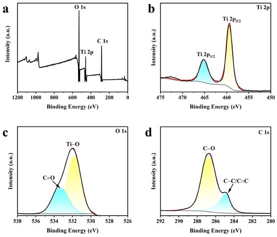 XPS measurements were performed to evaluate the surface chemical composition of CNTs@TiO2. Figure 3a–d plots the XPS measurement spectra with C 1 s, O 1 s, and Ti 2p. The existence of CNTs@TiO2 is confirmed by the XPS spectra’s C 1 s, O 1 s, and Ti 2p peaks. It is evident from the X-ray photoelectron spectra of Ti in Figure 3b that the presence of Ti4+ is demonstrated by the two distinctive peaks with binding energies of 459.3 eV and 465.1 eV, which correspond to Ti 2p3/2 and Ti 2pl/2 of Ti 2p, respectively [41]. From Figure 3c, the peak of binding energy at 531.8 eV in the X-ray photoelectron spectrum is derived from the O2- in TiO2 [42]; the peak with a binding energy of 533.3 eV comes from the C=O [43]. In Figure 3d, binding energy peaks at 284.8 eV and 286.7 correspond to the C-C or C=C bind and C-O, respectively [44]. Figure 3a–d shows the spectra of C 1 s, O 1 s, and Ti 2p, which proves that CNT@TiO2 was successfully synthesized and had -OH, -COOH function groups.