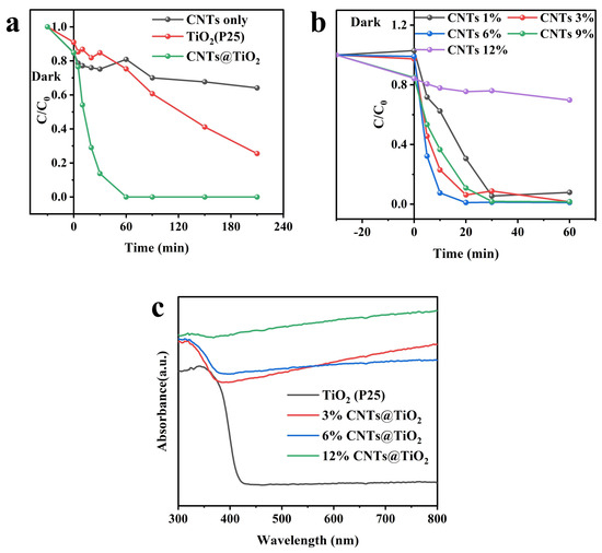 (a) Photocatalytic degradation performance of MO with different catalysts; (b) photocatalytic degradation performance of MO with CNTs@TiO2 of different ratios (CMO = 20 mg·L−1, VMO = 50 mL, catalyst dosage = 0.1 g·L−1); (c) UV adsorption spectra of the TiO2 (P25), 3% CNTs@TiO2, 6% CNTs@TiO2, and 12% CNTs@TiO2.