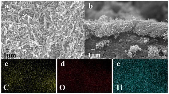 (a,b) SEM images of the surface and cross section of a PES/CNTs@TiO2 membrane; (c–e) EDS mapping of the three elements (The yellow dots represent the element C, the red dots denote the element O, and the blue dots signify the element Ti).