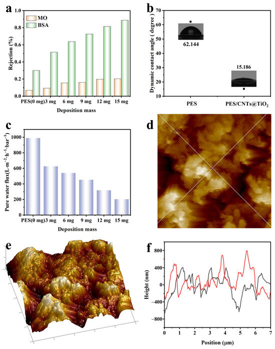 (a) Rejection of MO and BSA with different deposited CNTs@TiO2 mass; (b) dynamic contact angle of the pristine PES membrane and the PES/CNTs@TiO2 membrane; (c) pure water flux of the PES/CNTs@TiO2 membrane with different deposited mass; (d,f) height variations across the diagonal lines in the membrane surface testing area; (e) roughness of the PES/CNTs@TiO2 membrane.