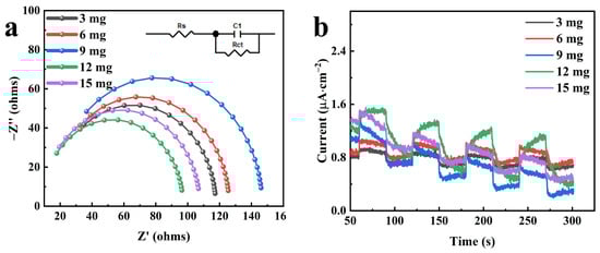 Electrochemical impedance spectroscopy (EIS) was employed to investigate the resistance of PES/CNTs@TiO2 membranes. In the Nyquist plots, the semi-circular arc is associated with the electrode’s interfacial charge transfer resistance (Rct). In contrast, the linear slope in the low-frequency region is related to the diffusion between the electrode and the electrolyte [53]. Figure 7a shows that only a single arc associated with the charge transfer step [54,55] was found in the high-frequency region. The resistance of the PES/CNTs@TiO2 membranes was fitted to be 130.4 ohms (3 mg), 111.5 ohms (6 mg), 130.6 ohms (9 mg), 87.99 ohms (12 mg), and 98.1 ohms (15 mg). The lowest resistance value was obtained when the deposition mass of CNTs@TiO2 was 12 mg, indicating enhanced electron transfer kinetics [21].