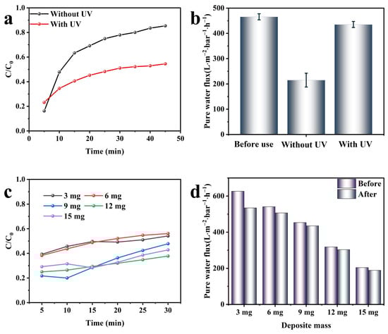 Furthermore, the modified membranes’ pure water flux (PWF) was measured before and after a single round of filtration. The flux decreased significantly from 465.5 ± 12 L·m−2·h−1·bar−1 to 215.0 ± 27.3 L·m−2·h−1·bar−1 after the filtration of MO without UV irradiation. Nevertheless, the PWF remained as high as 435.1 ± 11.8 L·m−2·h−1·bar−1 after the filtration of MO with UV irradiation, with an attenuation efficiency of only 6.5% (Figure 8b). The attenuation of the PWF might be attributed to the accumulation of MO on the membrane surface. Under UV irradiation, the MO attached to the membrane surface can decompose into small molecules that are easier to pass through the membrane pores, thereby maintaining the stability of the PWF. Without UV irradiation, the MO accumulated on the membrane surface will impede the PWF and lead to flux loss.