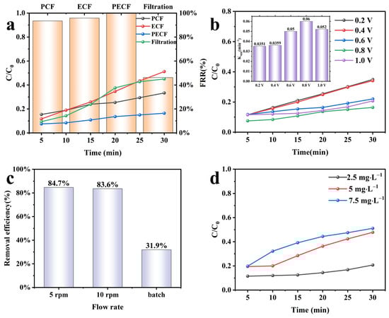 (a) MO degradation performance and flux recovery rate under different conditions (CMO = 2.5 mg·L−1, VMO = 50 mL, applied voltage = 0.8 V); (b) MO degradation performance under different applied voltages; (c) MO degradation performance under different flow rates; (d) MO degradation performance under different initial concentrations of MO.
