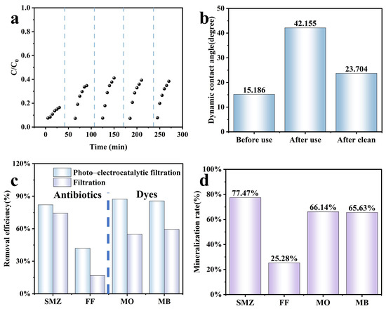 (a) Reusability test for photo-electrocatalysis degradation of MO by PES/CNTs@TiO2 membrane; (b) dynamic contact angle of PES/CNTs@TiO2 membrane: pristine, after use and after clean; (c) removal efficiency of different pollutants in the photo-electrocatalysis filtration system; (d) mineralization rate of four pollutants in the photo-electrocatalysis filtration system. ([SMZ, FF, MO, MB] = 2.5 mg·L−1, V = 50 mL, the CNTs@TiO2 deposited mass on PES = 12 mg, applied voltage = 0.8 V, solution flow rate = 10 rpm).