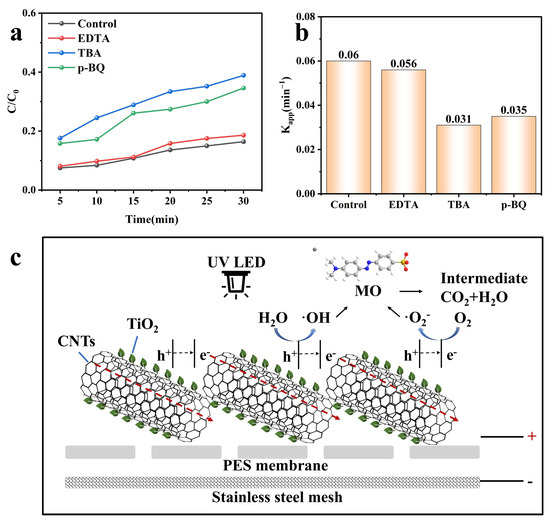 To investigate the primary active species and the potential degradation mechanisms of the photo-electrocatalysis filtration system, a series of experiments were conducted to capture active species using various scavengers (0.1 mM each), including EDTA for h+, TBA for ·OH, and p-BQ for ·O2− [72,73]. As presented in Figure 11a, the removal efficiency of MO was 81.4% (EDTA), 61.1% (TBA), and 65.4% (p-BQ) after 30 min of degradation. Furthermore, the corresponding Kapp values were 0.056, 0.031, and 0.035 min−1 respectively, as shown in Figure 11b. Based on the results, adding EDTA had no noticeable effect on the MO removal efficiency, indicating that h+ is not the main active species. Thus, ·OH and ·O2− are primarily accountable for the degradation of MO in the PES/CNTs@TiO2 photo-electrocatalysis filtration system. The photoelectrons excited by UV irradiation transfer to the conduction band, and subsequently they are utilized to reduce O2 and generate ·O2−. The mechanism of the photo-electrocatalytic filtration system is shown in Figure 11c. The reaction mechanism of MO can be described as follows:
