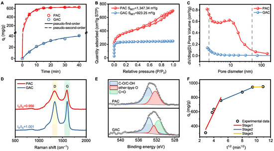 It is worth noting that the adsorption capacity of PAC and GAC is strongly correlated with specific surface area (SBET) (Figure 3B). Furthermore, Figure 3C shows that the larger SBET, along with a higher pore volume and greater abundance of micropores and mesopores, enables PAC to exhibit a higher adsorption capacity for sulfide and lower diffusion resistance compared to GAC. As suggested by Figure 3D, each AC shows two typical peaks located at ~1330 and ~1590 cm−1, which are assigned to disordered carbon defects (D band) and highly order graphitic carbon (G band) [40]. Compared with GAC, PAC exhibits a higher graphitization degree, which correlates with its superior adsorption capacity. This suggests that the enhanced graphitization of PAC may facilitate stronger anion–π conjugation interactions, thereby contributing to its higher adsorption capacity toward sulfide [41]. This finding was further supported by XPS spectra results. As shown in the deconvoluted profiles (Figure 3E), both PAC and GAC display similar peaks assigned to C–O (533.65 eV) and ether-type O (532.46 eV). Specifically, the peak related to C=O (531.62 eV) was only observed in the GAC, indicating that the doping of O atoms may have introduced defects into the GAC, leading to the destruction of part of its graphitic carbon structure [42].