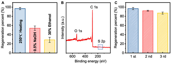 The spent PAC after adsorption was regenerated under different conditions. Thermal regeneration had a significant effect on the regeneration percent of the spent PAC (96.9%), while chemical regeneration showed a much lower regeneration percent (Figure 4A). Figure 4B demonstrates that almost no detectable sulfur signal was present, indicating that thermal regeneration effectively desorbs sulfides, making it a suitable method for regeneration [44]. After four cycles of adsorption and regeneration, the regeneration percent of PAC remained at 87.0%, with only a slight loss in adsorption capacity (Figure 4C).