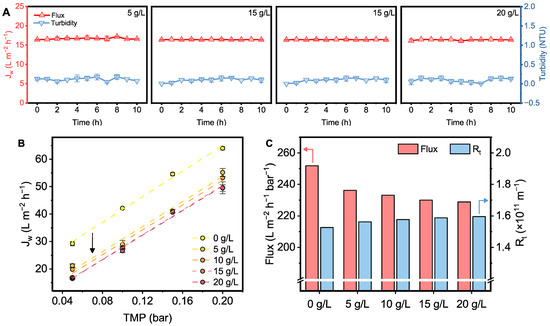 The tolerance of the flat-sheet submerged membrane under high-PAC-concentration conditions should be first evaluated. Here, we selected polypropylene microporous membranes for MF, which have emerged as one of the most widely used polymeric membranes due to their exceptional properties, cost-effectiveness, and ease of processing [45]. Figure 5A illustrates the stability of permeate water produced by the flat-sheet submerged membrane at different PAC concentrations. In these figures, we maintained a consistent initial permeate flux by adjusting the pressure. This approach allowed us to compare the stability of the membrane under the same initial permeate flux conditions, ensuring a controlled comparison at varying PAC concentrations. As the PAC dosage increased from 5 g L−1 to 20 g L−1, the permeate flux remained stable for at least 10 h, with no significant attenuation (15.10~16.65 L m−2 h−1). Furthermore, the turbidity of the permeate water remained below 0.25 NTU. As feedwater quality fluctuated due to seasonal weather conditions or submarine volcanic activity, simulations of the membrane under limiting conditions were also performed [46,47]. When the PAC dosage and permeate flux were increased to 50 g L−1 and 20 L m−2 h−1, respectively, this polymeric membrane still operated stably (Figure S2A,B), demonstrating its excellent ability to withstand high turbidity circumstance.