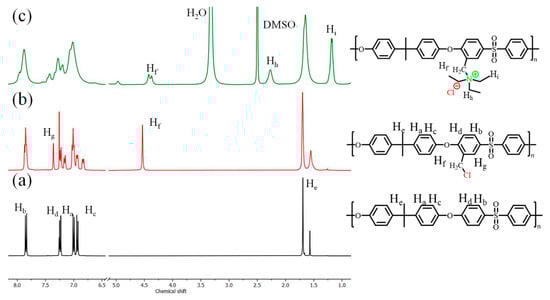 1H-NMR spectra of (a) PSf, (b) PSf−Cl, and (c) quaternized polysulfone polymers.