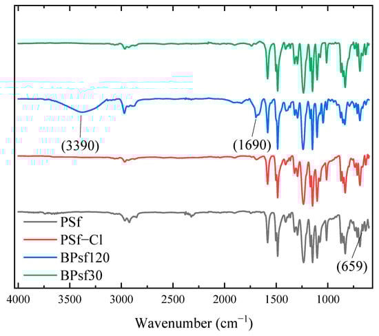 Figure 2 shows the FT-IR spectra of PSf and PSf−Cl, where the peak at 2968 cm−1 corresponds to the aliphatic stretching of C–H from the isopropyl groups of the backbone of PSf, and the peak at 1150 cm−1 corresponds to the symmetric stretching of the sulfone group. Asymmetric stretching of the sulfone group was observed at 1320 cm−1 and 1296 cm−1 []. Finally, other signals were observed at 1238 and 1012 cm−1, which were attributed to the asymmetric stretching of the ether species (C–O–C) [,]. The change in the shape of the band located at 660 cm−1 for the PSf−Cl spectra compared to PSf was attributed to C–Cl, as reported by Yang et al []. This is consistent with the 1H NMR results, indicating that PSf was modified.