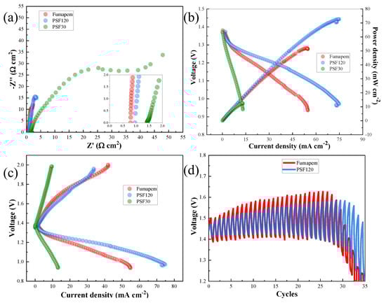 Nyquist plots (Figure 5a) revealed an increase in internal resistance in the ZABs when using the developed A-SPEs, primarily attributed to challenges in ion transverse transport across the membrane. Despite minor shifts toward higher resistances for the A-SPEs developed in this study, the measured battery resistance values indicated favorable interfacial interactions between the electrolyte and electrodes, which is a critical factor for functional device performance. Furthermore, the stable resistance values suggest successful cell assembly, achieved without precision tools, such as a torque wrench, highlighting the practicality of the proposed fabrication method. Notably, PSf120, with its high degree of functionalization, demonstrated a resistance value comparable to that of commercial A-SPE, underscoring its potential for scalable applications. This was further confirmed through cathodic linear polarization tests (Figure 5b), which showed poor performance for PSf30 and issues related to mixed control zones (between the activation and ohmic regions) for PSf120. Due to the higher ionic conductivity and KOH uptake values of PSf120, a current density of 74.58 mA cm−2 was achieved, representing a 42.43% increase compared to the commercial A-SPE.