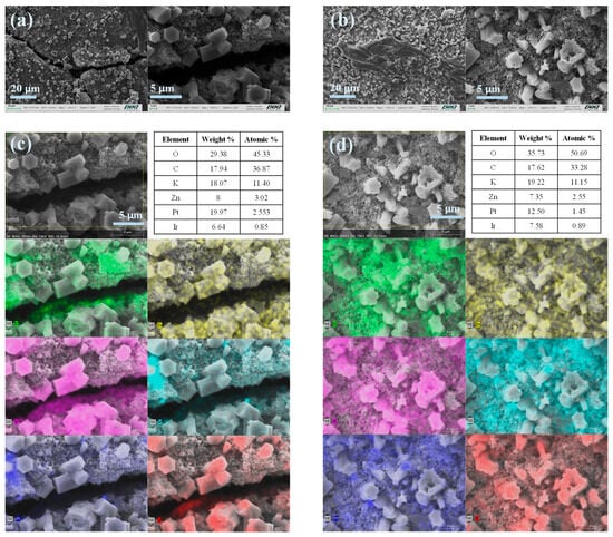 Postmortem analysis of cathodes. SEM micrographs of ZABs employed: (a) Fumapem and (b) PSF120. EDS and mapping analysis for ZAB with (c) Fumapem and (d) PSF120, each color represents a different element: C (green), Zn (yellow), K (pink), Ir (cyan), Pt (blue) and Cl (red).