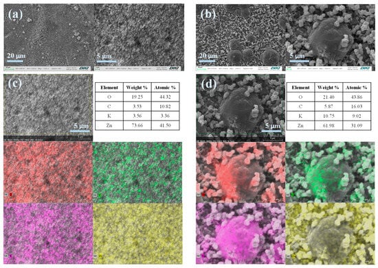 Postmortem analysis of Zinc electrodes. SEM micrographs of ZABs employed: (a) Fumapem and (b) PSF120. EDS and mapping analysis for ZAB with (c) Fumapem and (d) PSF120, each color represents a different element: O (red), C (green), K (pink) and Zn (yellow).