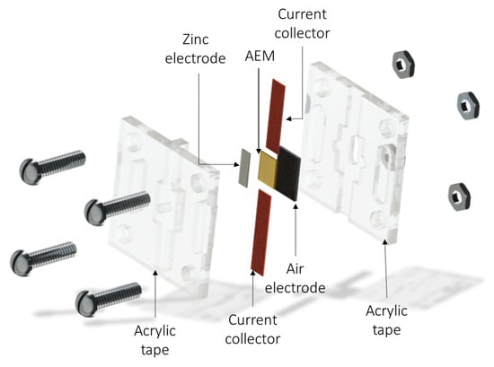 For the battery tests, a design consisting of two acrylic slotted plates that were mechanically sealed with screws was used. This design allowed tests to be conducted using small amounts of material, and the contact area between the cathode and anode was 0.06 cm2. A Sigracet 33 B (FuelCellStore ®) cathode was used as the current collector and coated with Pt-IrO2/C. The metallic charge used in the air electrode was 1 mg cm−2, and a piece of polished metallic zinc (99.9% purity) was used as the zinc electrode. In all cases, the membranes were activated in 1 M KOH for 24 h and then immersed in 6 M KOH before the cell assembly. Electrochemical Impedance Spectroscopy from 100 KHz to 100 Hz was used to evaluate the correct assembly of the ZAB. Linear voltammetry was used to evaluate the battery performance of different A-SPE materials. Charge and discharge cycles were evaluated at −0.5 mA cm−2 at discharge and 0.5 mA cm−2 at charge. Scheme 1 illustrates the battery assembly process.