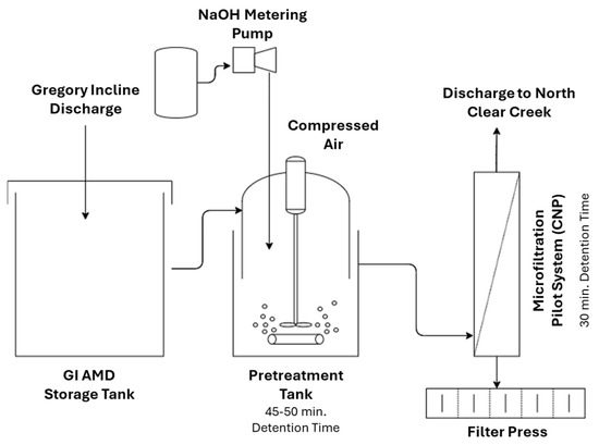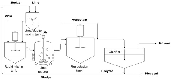 As a field-scale case study, Stewart compared three types of AMD active treatment systems at Blackhawk, Colorado, consisting of a high-density sludge (HDS) clarifier, a polymeric MF membrane, and a ceramic MF membrane [42]. The HDS clarifier system (Figure 4) was applied to recycle the sludge formed by lime precipitation, decreasing the overall process footprint and the utilization of lime.