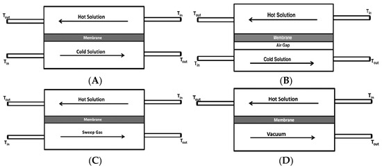 MD has been applied in various configurations with respect to the permeate side arrangement, namely direct contact membrane distillation (DCMD) [95,96], air gap membrane distillation (AGMD) [94,97], sweeping gas membrane distillation (SGMD) [98,99] and vacuum membrane distillation (VMD) [93,100].