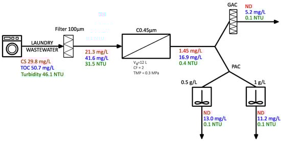 - Nascimento, C.O.C.; Veit, M.T.; Palácio, S.M.; Gonçalves, G.C.; Fagundes-Klen, M.R. Combined application of coagulation/flocculation/sedimentation and membrane separation for the treatment of laundry wastewater. Int. J. Chem. Eng. 2019, 2019, 8324710. [Google Scholar] [CrossRef]