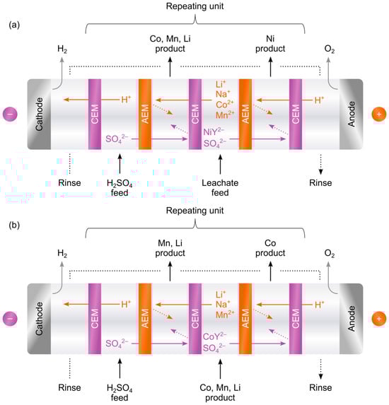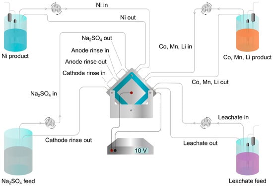 In hydrometallurgical recycling, LIBs are first discharged, milled, sieved, and treated by other mechanical methods to separate the plastic casing and electrode materials made of copper (Cu) and aluminum (Al). What remains is a fine black powder commonly referred to as black mass. It contains considerable amounts of graphite and most of the valuable metals—Li, Ni, Mn, Co—and is commonly leached with a mixture of 2–4 M sulfuric acid (H2SO4) and 1–5% (v/v) hydrogen peroxide (H2O2) at 60–80 °C. After removal of the solids by filtration, the leachate is commonly refined by solvent extraction (SX) [3,4,5,6]. This method enables large throughputs at high selectivity but is relatively expensive, chemical-intense, and uses fossil, flammable solvents [7], contributing significantly to the overall environmental impact of the recycling process [8]. A possible alternative to SX for refining of LIB leachates is electrodialysis, which has a lower risk of a negative impact on the environment and occupational safety [9]. Electrodialysis utilizes an electric field across an arrangement of cation-exchange membranes (CEM) and anion-exchange membranes (AEM) between two electrodes to transfer ions between different aqueous solutions [10,11].