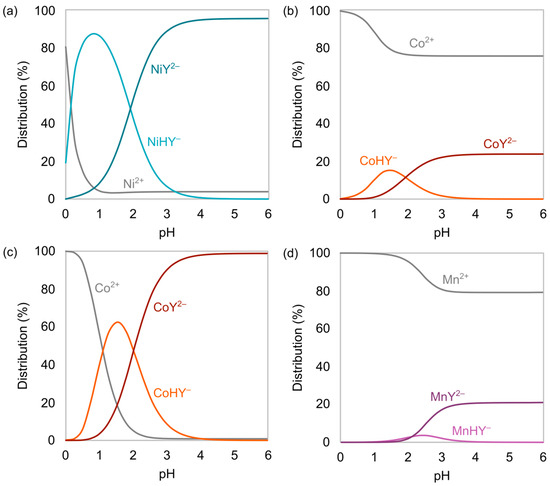 Speciation of Ni (a) and Co (b) with an EDTA addition equal to 1.2 times the Ni molar amount, as well as Co (c) and Mn (d) speciation upon Ni removal and an EDTA addition equal to 1.1 times the Co molar amount.