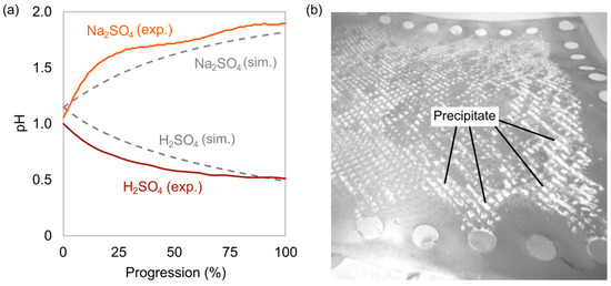 (a) Experimental and simulated pH of the Ni product using H2SO4 or Na2SO4 as secondary feed, showing electrodialysis progress (percent Ni recovered) for the 1.2 scenario with a synthetic leachate, (b) White precipitate on an AEM when H2SO4 was used as secondary feed.
