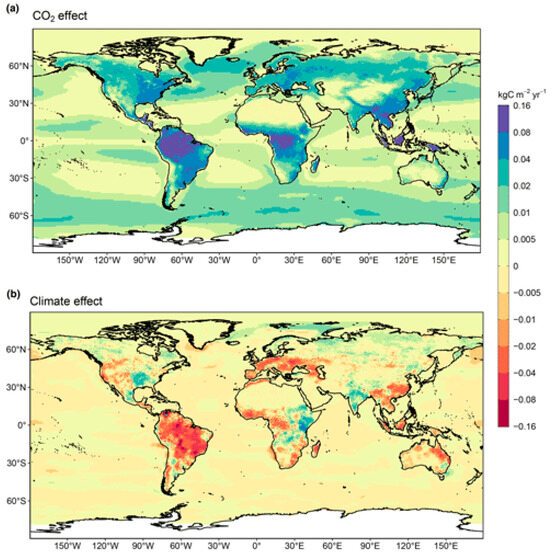 (a) Distribution of the CO2 concentration in the atmosphere and (b) change in climate in 2013–2022. Reproduced from [4] with Open Access.