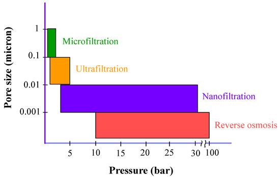 Typical pore sizes and applied pressure of main pressure-driven membrane operations. For the sake of figure readability, the pore size values on the y-axis are not to scale.