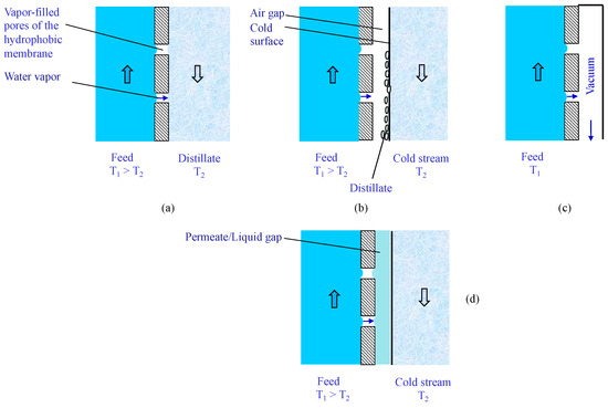 Main MD configurations. (a) Direct contact membrane distillation. (b) Air gap membrane distillation. (c) Vacuum membrane distillation. (d) Permeate/liquid gap membrane distillation.