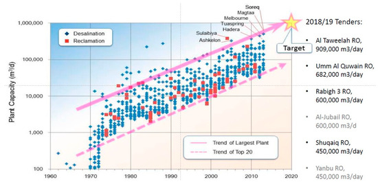 Trend of RO desalination plant capacity. Reproduced from [7] with Open Access.