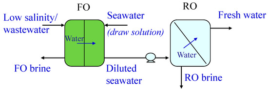 Forward osmosis (FO) as a pre-treatment to reduce the salinity of the RO feed. The seawater is first diluted in the FO unit and then sent to the RO for freshwater production.