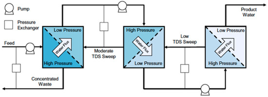Another approach investigated to reduce the SEC in SWRO involves the dilution of seawater before it enters the RO units, since by lowering the feed concentration, the pressure needed for permeation is also lowered. In particular, two systems were studied and compared as a pre-treatment: forward osmosis (FO) [9,10,11] and osmotic-assisted RO (OARO) [12,13,14]. In the FO-RO system, seawater is used as a draw solution to concentrate a low salinity/wastewater stream so that a diluted seawater can be sent to the RO unit (Figure 7). The low salinity/wastewater (feed) is sent to one side of the FO membrane, while the seawater (draw solution) flows at the other side. The unit works at atmospheric pressure. Due to the difference in osmotic pressures between the feed and the draw solution, water moves through the membrane from the feed, which is concentrated (FO brine), to the seawater, which is diluted. The diluted seawater is finally sent to the RO unit to recover fresh water at lower operating pressures (therefore at lower energy consumptions). In OARO, different stages of permeation are present before the RO unit, each one equipped with pressure exchangers as ERDs, working with a lower concentrated stream at the permeate side, in order to reduce the osmotic pressure difference. In this way, the concentration of the stream sent to RO is significantly lower than that of the original feed. This solution was proposed mainly for high salinity feeds. Figure 8 shows an OARO system with two stages before the RO unit. The high salinity feed is sent under pressure to the first stage at one side of the membrane, while at the other side it is sent a low-pressure saline stream (less concentrated than the feed) in order to establish a hydraulic pressure difference across the membrane that is higher than the osmotic pressure difference. The water moves from the feed to the permeate, which is diluted and is sent, after its pressurization, as feed to the second stage. In this stage, a low-pressure saline stream (less concentrated than the permeate produced in the first stage) is sent to the other side of the membrane to receive water from the feed. The diluted permeate stream produced in the second stage is finally pressurized and sent as feed to a “classical” RO module, from which freshwater can be recovered.