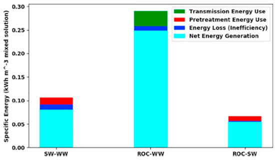 The pressurized RO brine was used to produce energy in pressure-retarded osmosis (PRO) units [16,17,18]. In PRO, the RO brine can be employed as the draw solution at the permeate side of the membrane, while a solution with a lower concentration is sent at the feed side. The water permeating from the feed to the draw side leads to a dilution of the pressurized stream, which can be used for power generation in a turbine. Benjamin et al. [17] analyzed the energy that can be generated in a Tampa Bay SWRO desalination plant by PRO working with different draw/feed streams. As shown in Figure 9, the highest net energy generation was obtained for the combination RO brine (ROC)/wastewater (WW), followed by SW/WW and ROC/SW. This result puts in evidence that if no low concentrated water (like WW) is available close by the desalination plant, a relatively low amount of energy can be produced with the only streams involved in RO (SW and RO brine).
