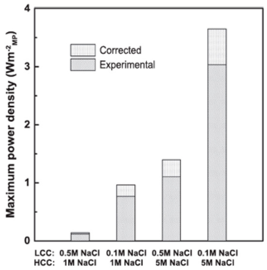 The maximum power density achievable by RED with different combinations of LCC and HCC streams. Reproduced from [19] with the permission from the Publisher. Copyright 2016, Elsevier.
