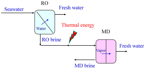 Scheme of an RO–MD integrated system in desalination. The RO brine is sent as feed to the MD unit where it evaporates, producing more fresh water.