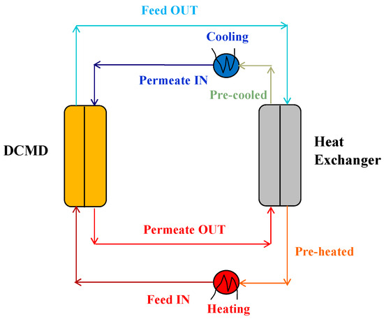 In DCMD, the heat of condensation acquired by the permeate stream can be used to pre-heat the feed exiting the module before its recirculation, as sketched in Figure 13. In this way, the permeate is also pre-cooled before being recycled back to the DCMD module.