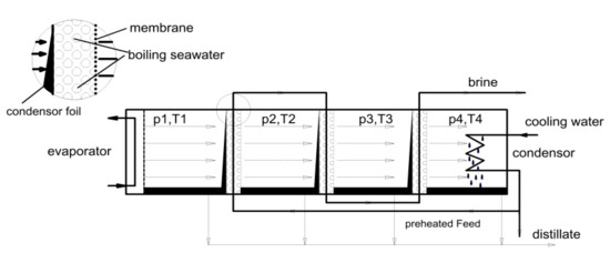 The memsys design. A series of effects with membranes and condensing foils is used for continuous evaporation and condensation. Reproduced from [38] with the permission from the Publisher. Copyright 2012, Elsevier.