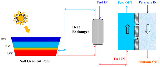 However, it is worth mentioning that SGSPs are suitable only for specific locations on Earth: near the ocean and with enough solar radiation. Suárez and Urtubia [47] reported locations between 40° N and 40° S as being suitable, for which the useful heat varied from 40 to 112 W/m2 with a water production ranging from 1.05 to 2.95 L/day m2 of solar pond, respectively. Interestingly, the area of membrane distillation units was always less than 1% of the solar pond area, an indication of the high footprint of SGSPs. Moreover, in their work, five selected sites were indicated: Cape Town (South Africa), Jeddah (Saudi Arabia), Darwin (Australia), Los Angeles (USA), and Copiapò (Chile). A comparison between solar systems and SGSPs was carried out by Méricq et al. [62] who studied two configurations for both SGSPs and solar collectors (SCs). In one configuration, the hot feed was sent to the MD module, while in the other configuration the membrane module was directly heated by submerging it in the SGSP or by integrating the SC onto the module-self, at the feed side. VMD was the investigated MD configuration in a wide range of operating conditions (0–300 g/L of feed concentration; 100–10,000 Pa of permeate pressure; 20–70 °C of feed temperature). The submerged module in the SGSP, although it represented the solution with the lowest energy requirement, was characterized by the lowest fluxes due to a significant temperature and concentration polarization as well as high maintenance and difficult technical feasibility. By coupling the MD module with the SGSP, higher fluxes were obtained, but still considerable maintenance was required. Both configurations with SCs led to higher flux values, required little maintenance, but resulted in being more expensive than SGSPs. The integration of the SC onto the module-self was more difficult from a technical point of view and could lead to temperature radial profiles, with a consequent reduction in flux, with respect to the use of SC to heat the feed outside the module. Therefore, the authors concluded that the use of SC, with the hot feed sent to the module, should be the preferred option.