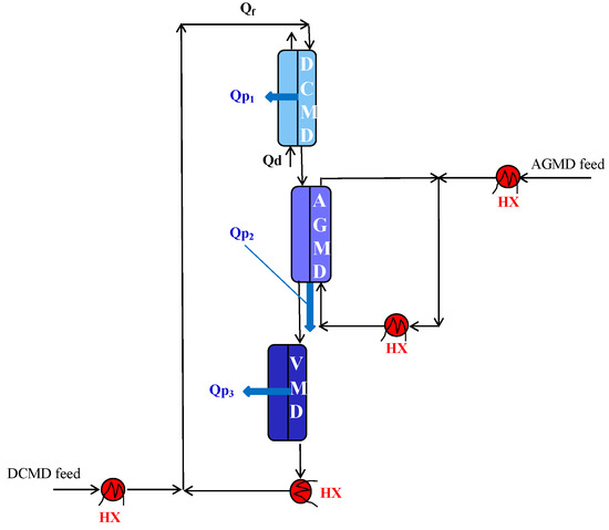 Other strategies to reduce the thermal energy consumption in membrane distillation were investigated, even if only currently at a research stage/small scale. For example, in pressure-retarded membrane distillation (PRMD), the volume increment of the condensation liquid was used to drive a hydraulic turbine. This system allowed 188 L of high-quality freshwater to be produced from 0.5 M NaCl solution with 27.8 kJ power per day for a 1.0 m2 heating area [63] and can be applied also for the treatment of more concentrated streams, like RO brines. The integration of different MD configurations was also proposed as a possible way to reduce the STEC in membrane distillation [64,65,66]. This strategy was developed to cover also the applications where low feed temperatures (e.g., 40 °C) are needed, and for which heat recovery systems cannot be applied. In particular, DCMD was coupled with both AGMD and VMD units. AGMD replaced the conventional heat exchanger to supply the heat lost by the feed stream in the DCMD unit through the heat of vapor condensation, while producing more permeate (Qp). VMD was considered to improve the overall permeate production. Various combinations were investigated. In the DCMD-AGMD-VMD integration (Figure 17), the stream exiting DCMD was sent as a cold liquid in AGMD, where it was heated by receiving the heat of condensation of the vapor produced in AGMD. Afterwards, the heated stream was sent to a VMD unit where it was further treated to produce more permeate. In Figure 17, the HXs needed to warm up the involved streams up to the desired temperatures are also shown. When compared to the DCMD-HX conventional system, the DCMD-AGMD-VMD integrated configuration led to a 515% higher permeate production and a 48% lower STEC [66]. Moreover, the MD integrated units resulted to better fit the logic of the process intensification, showing a productivity/size ratio [67] greater than that of the conventional system.