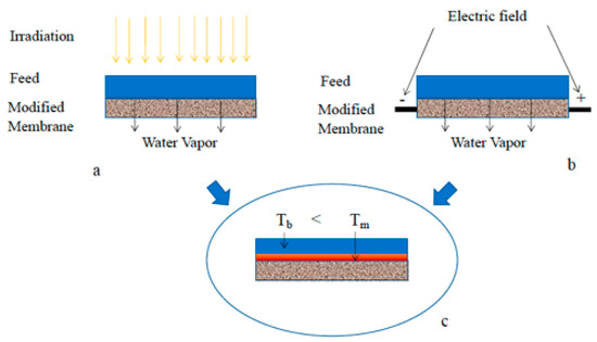 (a) Photo-thermal membrane under irradiation; (b) electro-thermal membrane under electric field; (c) temperature profile developed between the bulk feed and the membrane surface. Reproduced from [77] with Open Access.