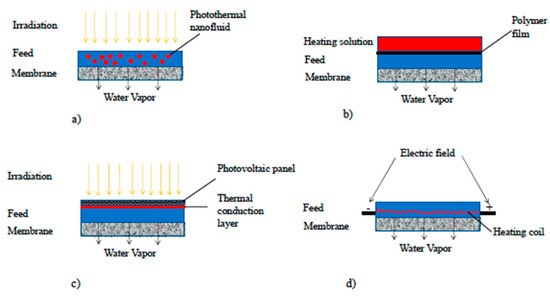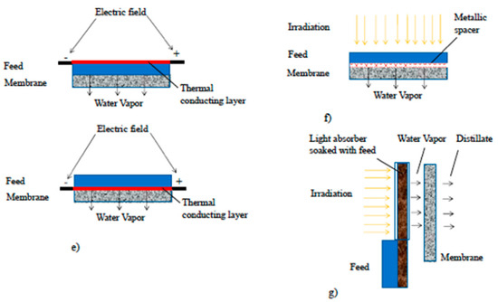 Both photo- and electro-thermal membranes need the modified membranes to be prepared first. Afterwards, in the case of electro-thermal membranes, the electricity has to be supplied, while for the photo-thermal membranes, a specific module to allow the irradiation to reach the membrane surface must be designed before the irradiation step. Localized heating can also be achieved inside the modules (without modifying the membrane), as shown in Figure 19 [78,79,80,81,82]. In particular, a possible strategy could be to use photothermal nanofluids in the feed, which is irradiated through a quartz window, so that nanofluids could absorb the solar radiation and transform it into heat (Figure 19a). The feed can also be heated through a polymer film in contact with a heating solution (Figure 19b) or by applying a thermal conductive layer on the backside of a photovoltaic panel (Figure 19c). In the latter, the waste heat of the solar cell can be transferred through the layer to the feed, which is heated. A heating coil inside the module, located close to the membrane surface and connected to an electric circuit, can be another way to heat the feed inside the module (Figure 19d). Similarly, thermal conductive layers connected to electricity can be placed inside the feed channel, also close to the membrane surface, for the feed heating (Figure 19e). The use of metallic spacers coated with photocatalysts and located close to the membrane was also studied as an option for heating the feed under irradiation (Figure 19f). An alternative system was investigated by Gong et al. [83] to reduce fouling issues of the MD membrane. In this system, the membrane was not in direct contact with the feed, which is absorbed by a graphene–nickel foam with a polymer coating. Under irradiation, the feed evaporated. The produced vapor, after migration into a gap, moved through the membrane, which blocked all microorganisms at one side and led to the final distillate at the other side (Figure 19g). All the systems investigated led to an improvement of flux and to a reduction in energy consumption, with a SEC ranging from 0.58 to 2.8 kW/kg [48]. As previously reported, also in this case, the high variability registered in SEC values depends on the different system designs and operating conditions adopted.